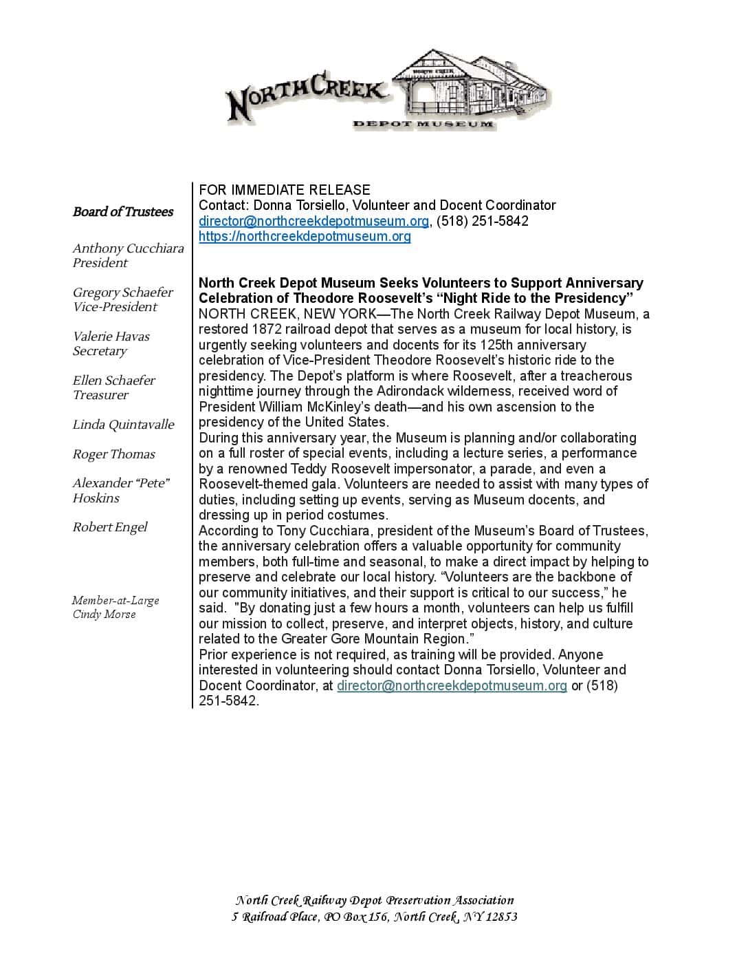 Call 518 – 251 – 5842 or Email director@northcreekdepotmuseum.org
