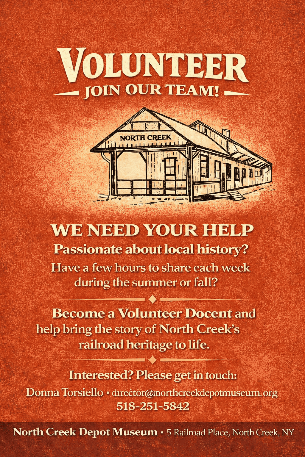 - For special group tours in and out of season, contact 518-251-5842 or director@northcreekdepotmuseum.org.